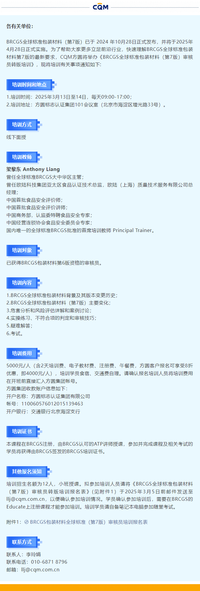 關于舉辦BRCGS全球標準包裝材料(第7版)審核員轉版培訓的通知